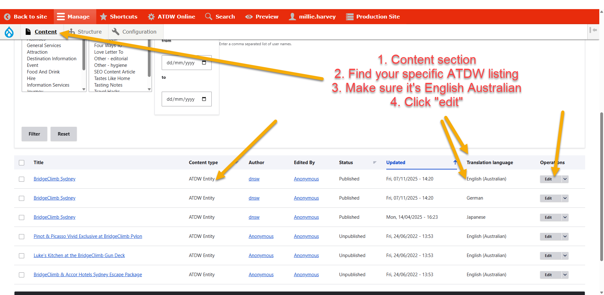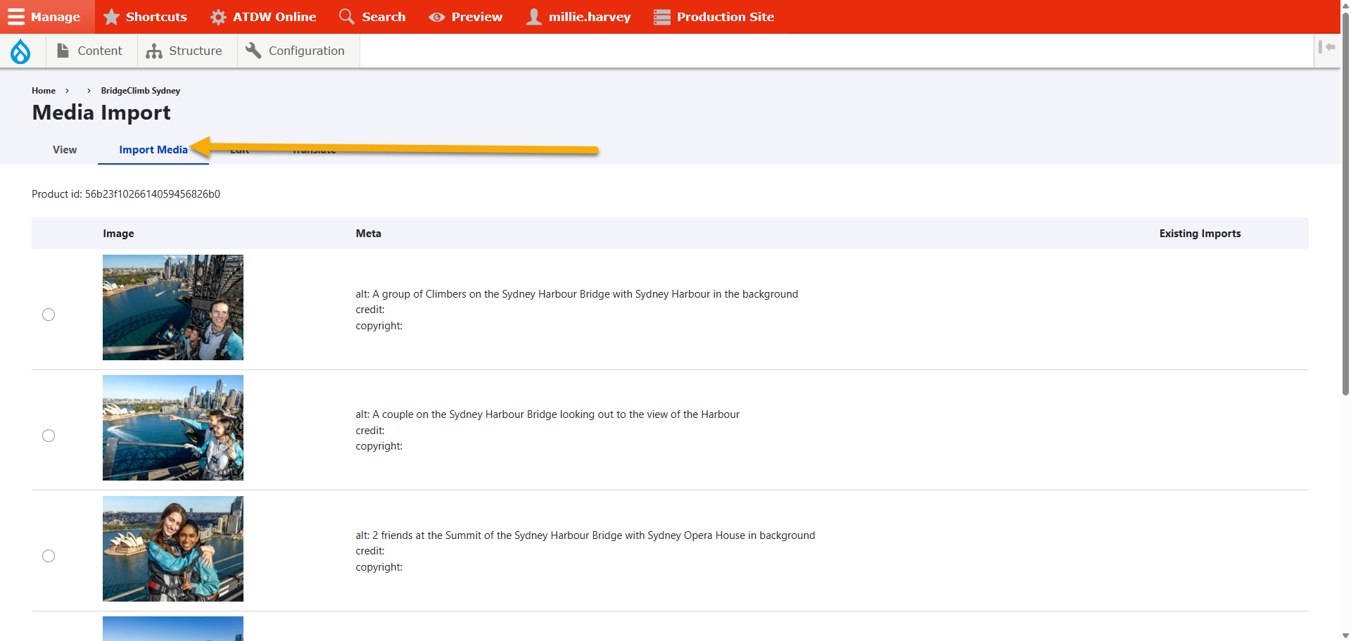 Once the product has had the new sync, you can then import the images. - In the "content" section of the site, search the ATDW listing: https://www.sydney.com/admin/content